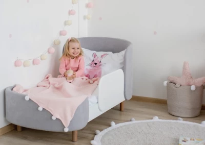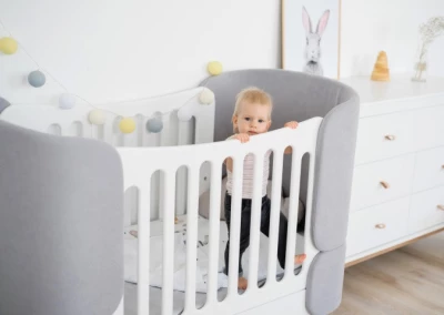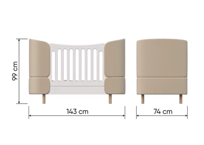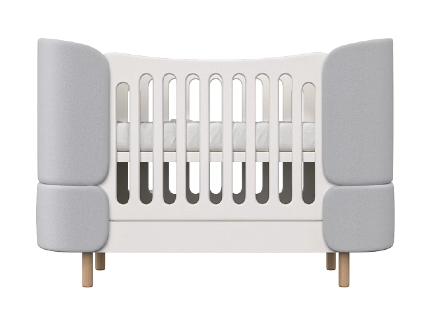 Кроватка-трансформер KIDI Soft с мягкими текстильными спинками имеет увеличенный размер спального места, что позволяет использовать кроватку даже в базовой комплектации до 4 лет