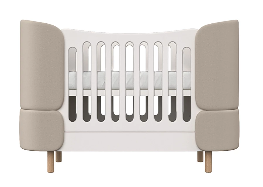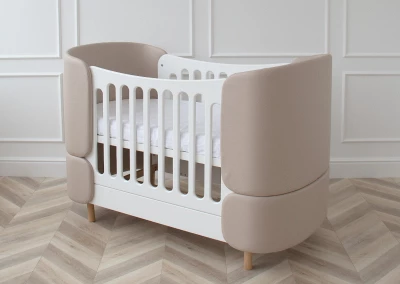 Кроватка-трансформер KIDI Soft с мягкими спинками из экокожи имеет увеличенный размер спального места, что позволяет использовать кроватку даже в базовой комплектации до 4 лет