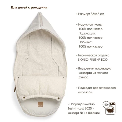 Высококачественные молнии, открывающиеся с обоих концов, облегчают посадку и высадку ребенка из автокресла, а откидной элемент обеспечивает мгновенный контроль температуры. Большой капюшон защищает от ветра и сохраняет тепло. Когда капюшон не нужен, его можно открыть и сложить с помощью встроенной молнии. Конверт можно стирать в стиральной машине, а значит, его легко содержать в чистоте и свежести.