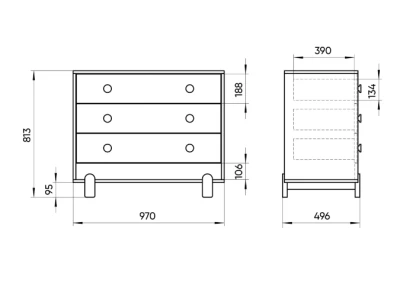 У комода три вместительных ящика на бесшумных направляющих с доводчиками