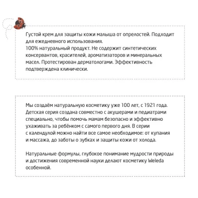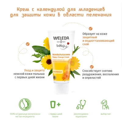 Weleda крем для младенцев с календулой для защиты кожи в области пеленания! Ингредиенты крема, такие как ланолин (натуральный жир шерсти овцы), воск и особенно оксид цинка формируют естественный защитный слой для нежной кожи Вашего малыша от влаги, которая является раздражающим фактором для его кожи.