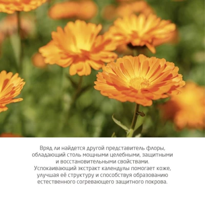 Экстракты календулы и ромашки успокаивающее действуют на кожу. Календула обладает лечебным эффектом, а ромашка снимает воспаление и успокаивает кожу.