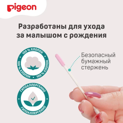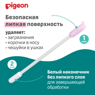 Ватные палочки с уникальным липким слоем позволяют быстро и легко очистить носик, ушки и пупок малыша! Розовый наконечник имеет липкую поверхность для быстрой гигиены новорожденного – все корочки прилипают и легко удаляются. Белый наконечник без липкого слоя – для завершающей обработки. Безопасный бумажный стержень. Тонкий наконечник удобен для чистки маленьких ушек и носиков.